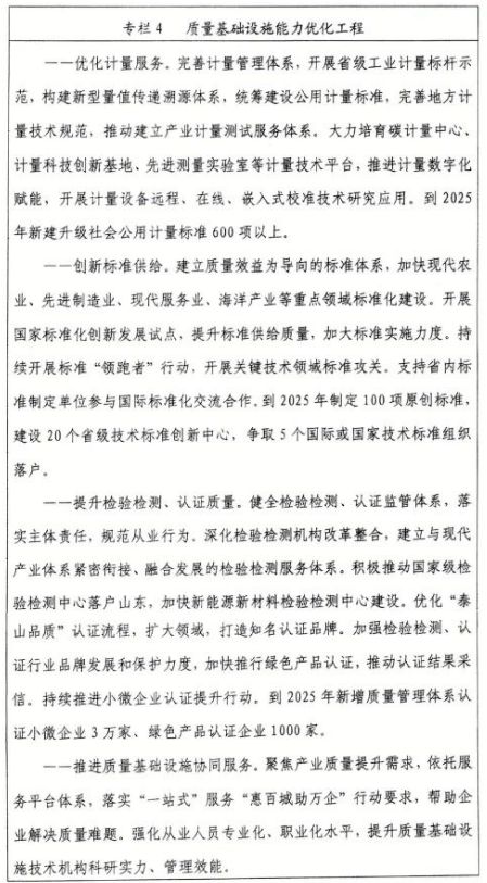 (十七)加快質(zhì)量基礎(chǔ)設(shè)施集約創(chuàng)新。合理布局質(zhì)量基礎(chǔ)設(shè)施,加快建設(shè)各類質(zhì)量基礎(chǔ)設(shè)施公共服務(wù)平臺(tái),推動(dòng)計(jì)量、標(biāo)準(zhǔn)、檢測(cè)、認(rèn)證集約服務(wù)產(chǎn)業(yè)鏈發(fā)展。開展質(zhì)量基礎(chǔ)設(shè)施能力提升行動(dòng),加強(qiáng)碳計(jì)量標(biāo)準(zhǔn)、技術(shù)規(guī)范研發(fā),推進(jìn)標(biāo)準(zhǔn)數(shù)字化建設(shè),加快認(rèn)證認(rèn)可技術(shù)研究由單一要素向系統(tǒng)性、集成化方向發(fā)展。圍繞高端制造、新材料、信息技術(shù)、生物醫(yī)藥等領(lǐng)域建設(shè)省級(jí)質(zhì)量標(biāo)準(zhǔn)實(shí)驗(yàn)室,爭(zhēng)創(chuàng)國(guó)質(zhì)量標(biāo)準(zhǔn)實(shí)驗(yàn)室、國(guó)家技術(shù)標(biāo)準(zhǔn)創(chuàng)新基地、國(guó)家產(chǎn)業(yè)計(jì)量測(cè)試中心、國(guó)家質(zhì)檢中心。鼓勵(lì)企業(yè)加強(qiáng)質(zhì)量技術(shù)創(chuàng)新中心建設(shè)。制定支持質(zhì)量基礎(chǔ)設(shè)施科技創(chuàng)新的政策措施,圍繞質(zhì)量基礎(chǔ)設(shè)施科技攻關(guān),在省級(jí)科技計(jì)劃中立項(xiàng)研究項(xiàng)目、課題或?qū)n}設(shè)立重點(diǎn)專項(xiàng)。