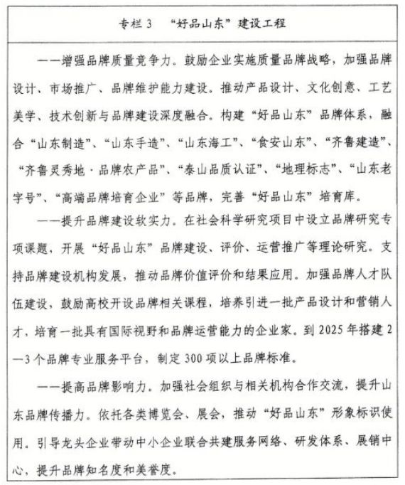 (十三)提升品牌知名度。支持企業(yè)實(shí)施品牌戰(zhàn)略,提高品牌運(yùn)營(yíng)能力,打造一批高端品牌。宣講山東品牌故事,傳播山東品牌文化,增強(qiáng)消費(fèi)者對(duì)“好客山東 好品山東”的品牌認(rèn)同。建立企業(yè)自我保護(hù)、行政保護(hù)、司法保護(hù)三位一體的品牌保護(hù)體系,嚴(yán)厲打擊品牌仿、商標(biāo)侵權(quán)等違法行為,為品牌發(fā)展創(chuàng)造良好環(huán)境。